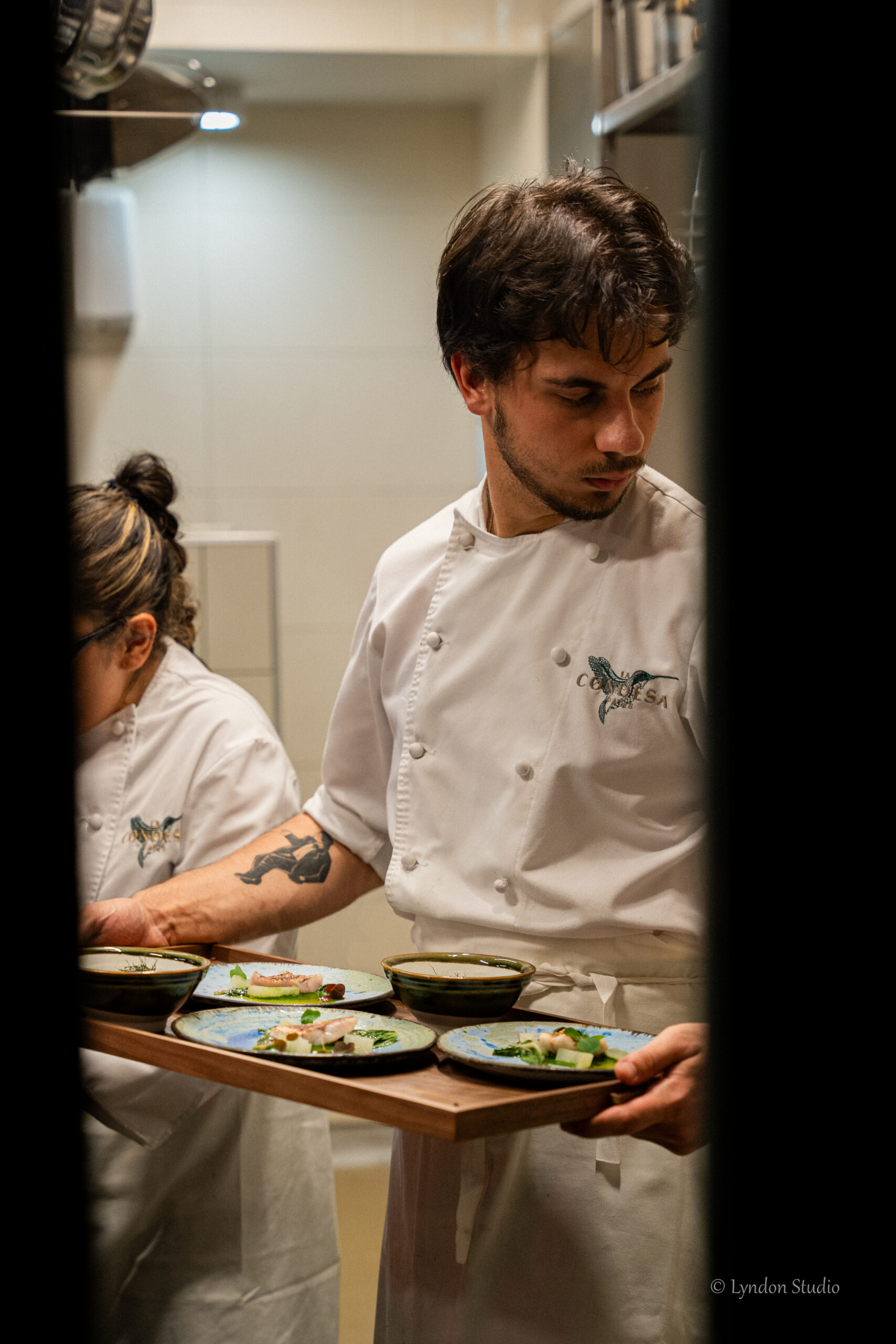 Dans la chaleur tamisée de la cuisine, le chef Indra Carrillo Perea et ses assistants s’activent avec rigueur. Chaque mouvement est une note dans cette symphonie culinaire, où la concentration et la passion s’entrelacent.