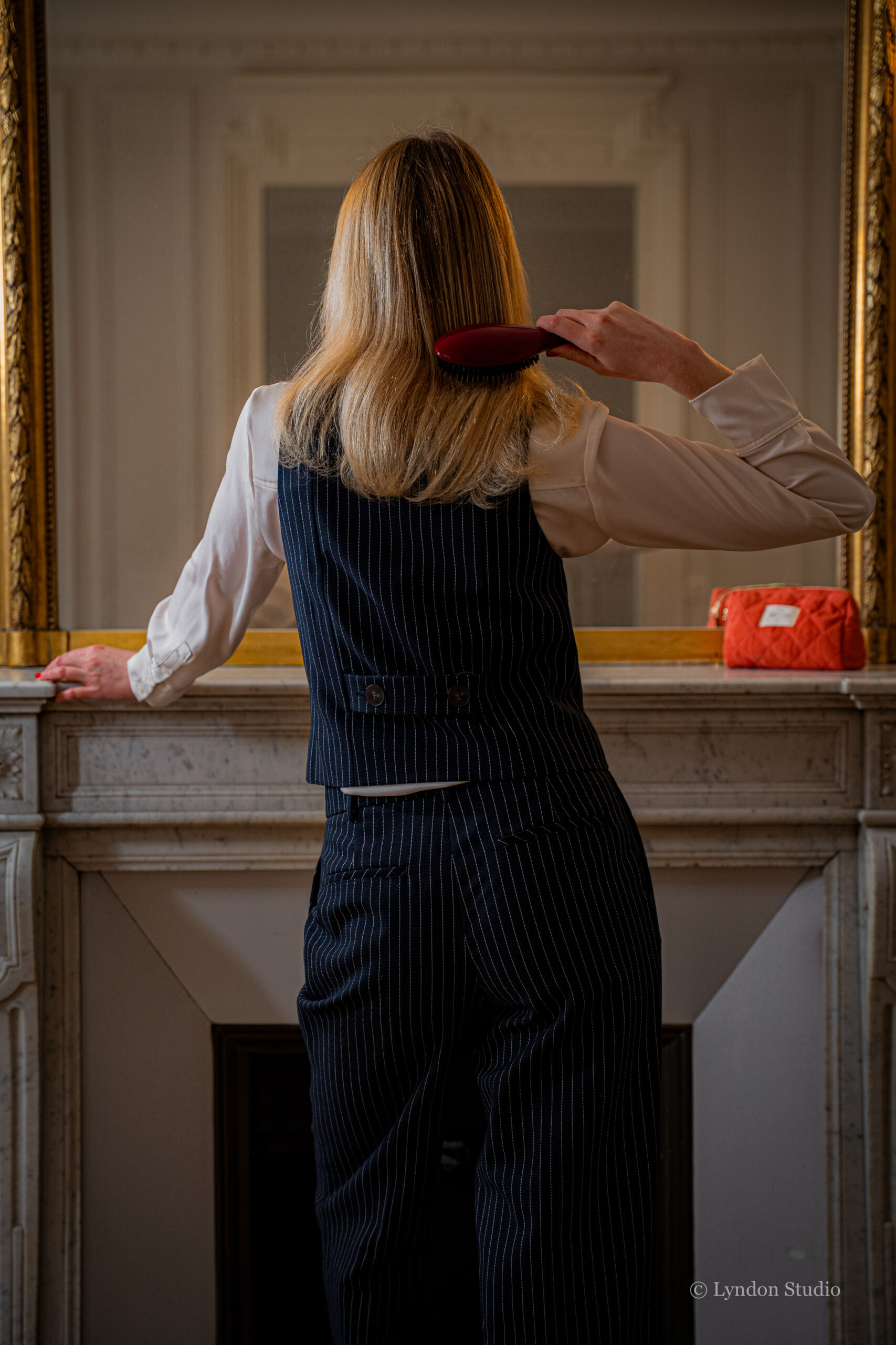 Une femme de dos, face au miroir, ajuste son allure dans un geste intime et suspendu. L’image joue sur la suggestion et la délicatesse, évoquant une élégance naturelle et intemporelle.