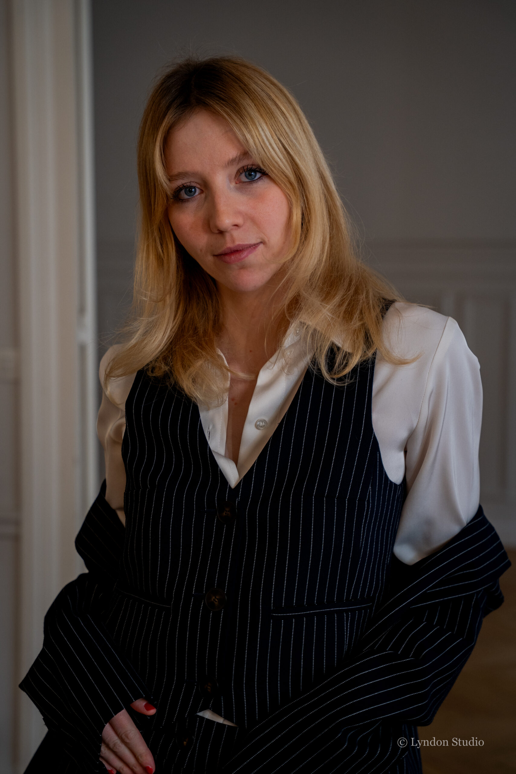 Portrait frontal en costume Sézane, où le regard et la posture composent une image forte, pensée comme une publicité mode épurée et affirmée.