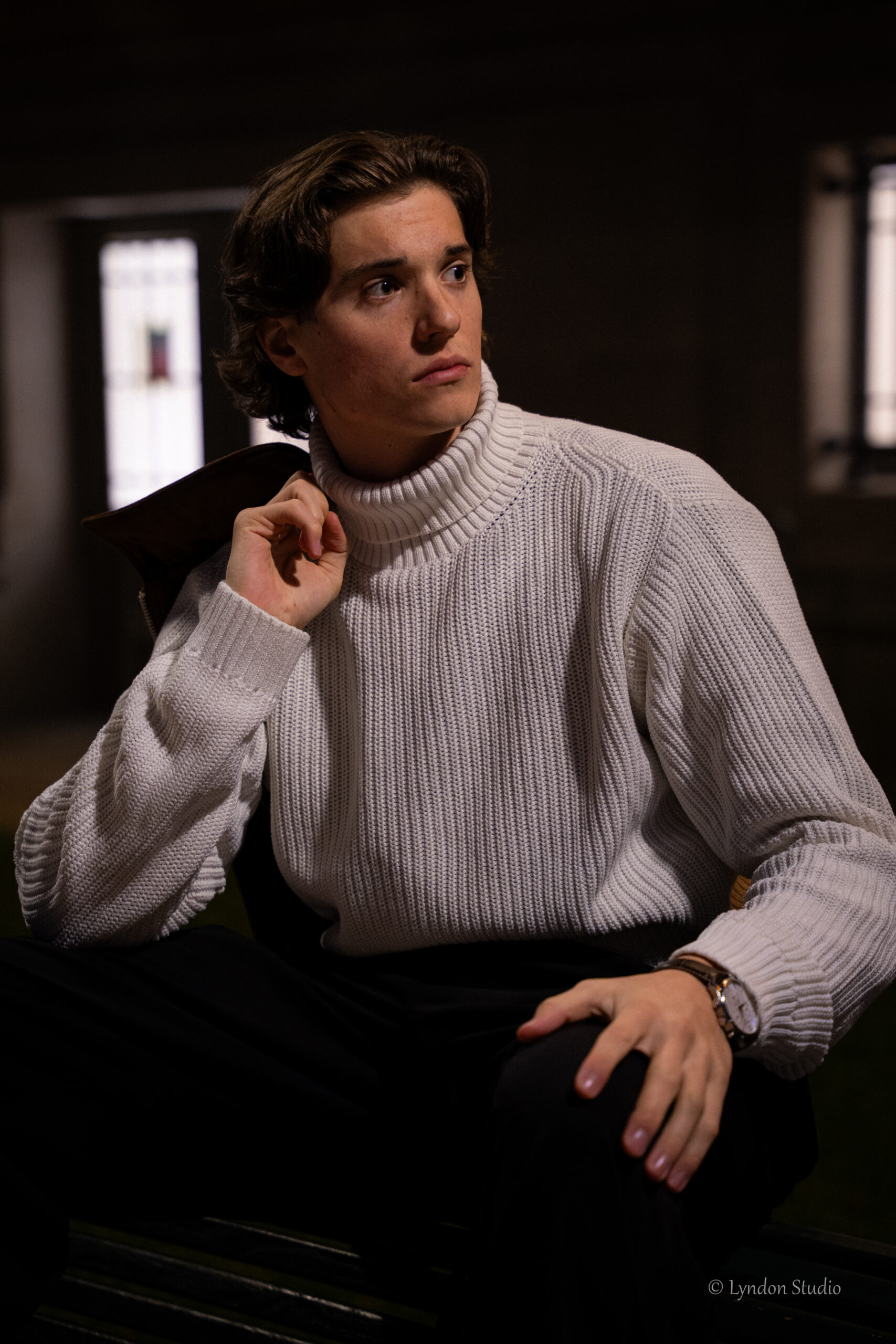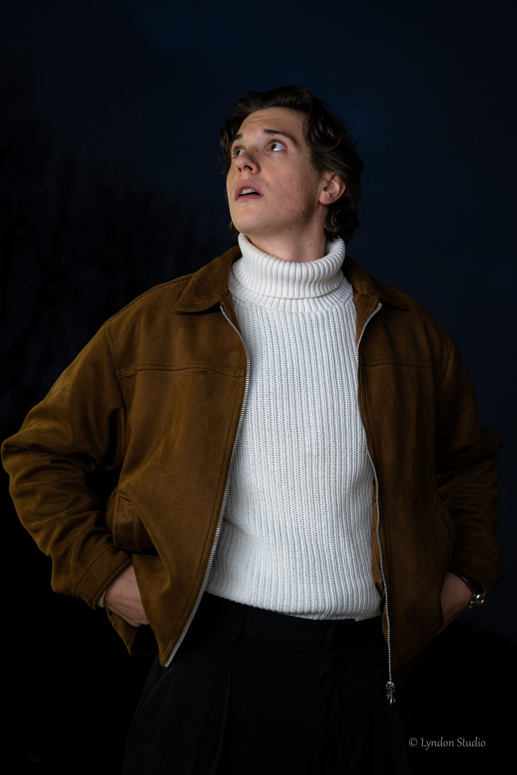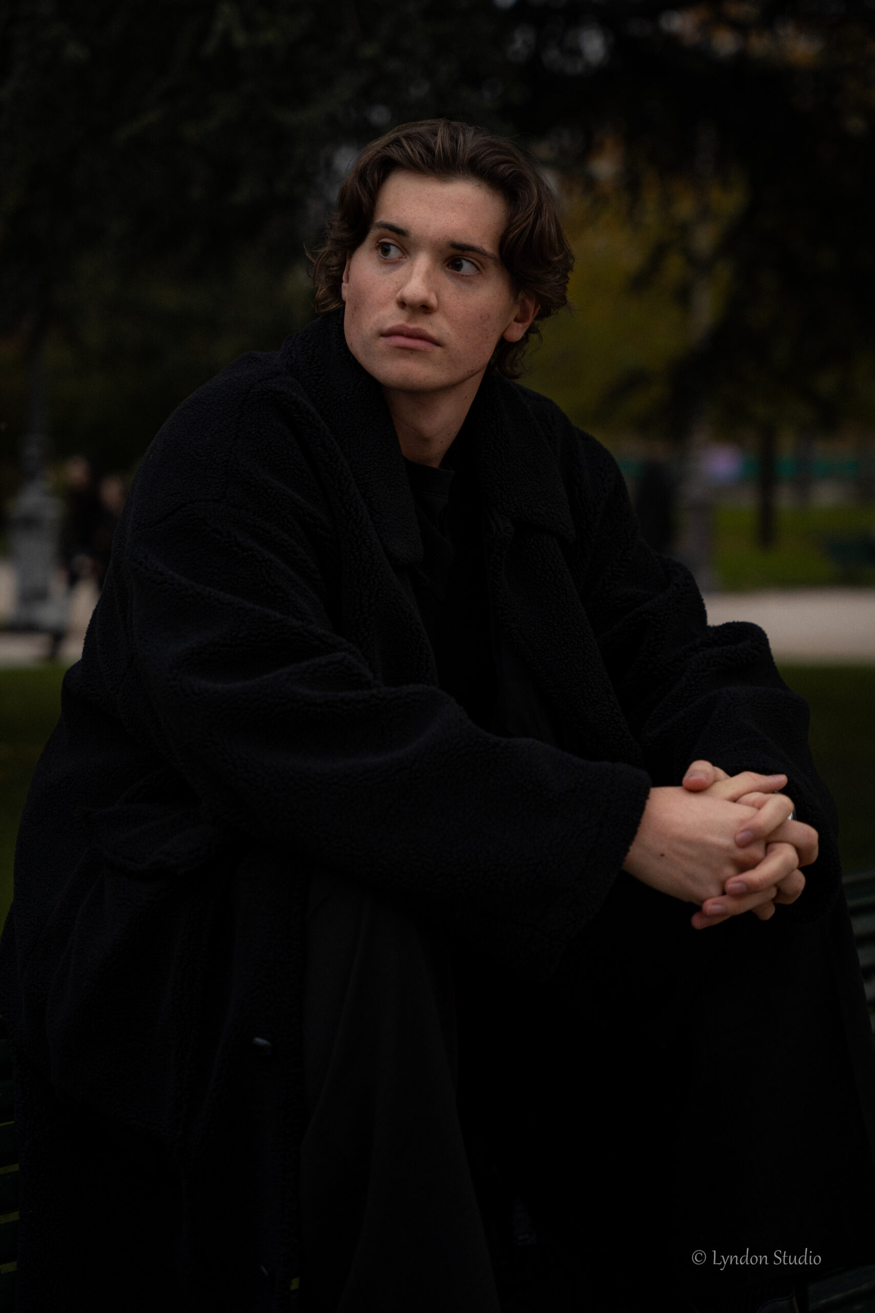 La prestance d’un modèle tient dans son attitude, et non pas dans ses ornements. J’ai conseillé à Théodore de se vêtir d’une longue veste noire pour mieux capturer l’expression de son visage et de ses mains. Il se place à l’avant d’un grand arbre, partiellement éclairé par un rayon déclinant. À nouveau, son aplomb est souverain.